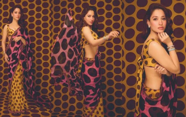 सबसे पहले, बोल्ड पोल्का डॉट्स आपका ध्यान खींचते हैं। साड़ी में सरसों पीला और गहरा गुलाबी जैसे विपरीत रंगों का मेल है। इस पर बड़े-बड़े काले डॉट्स की लेयरिंग की गई है जो बॉलीवुड प्रिंट्स और 70 के दशक के फैशन की याद दिलाती है। यह बोल्ड और बेबाक है – तमन्नाह के स्टाइल से पूरी तरह मेल खाती है। यह साड़ी पूरे लुक में सही मात्रा में नाटकीयता जोड़ रही है। इसे साफ-सुथरा और पारंपरिक रखने के बजाय, साड़ी स्वतंत्र रूप से लहरा रही है, और पल्लू को इस तरह स्टाइल किया गया है जो किसी फिल्म की याद दिलाता है।